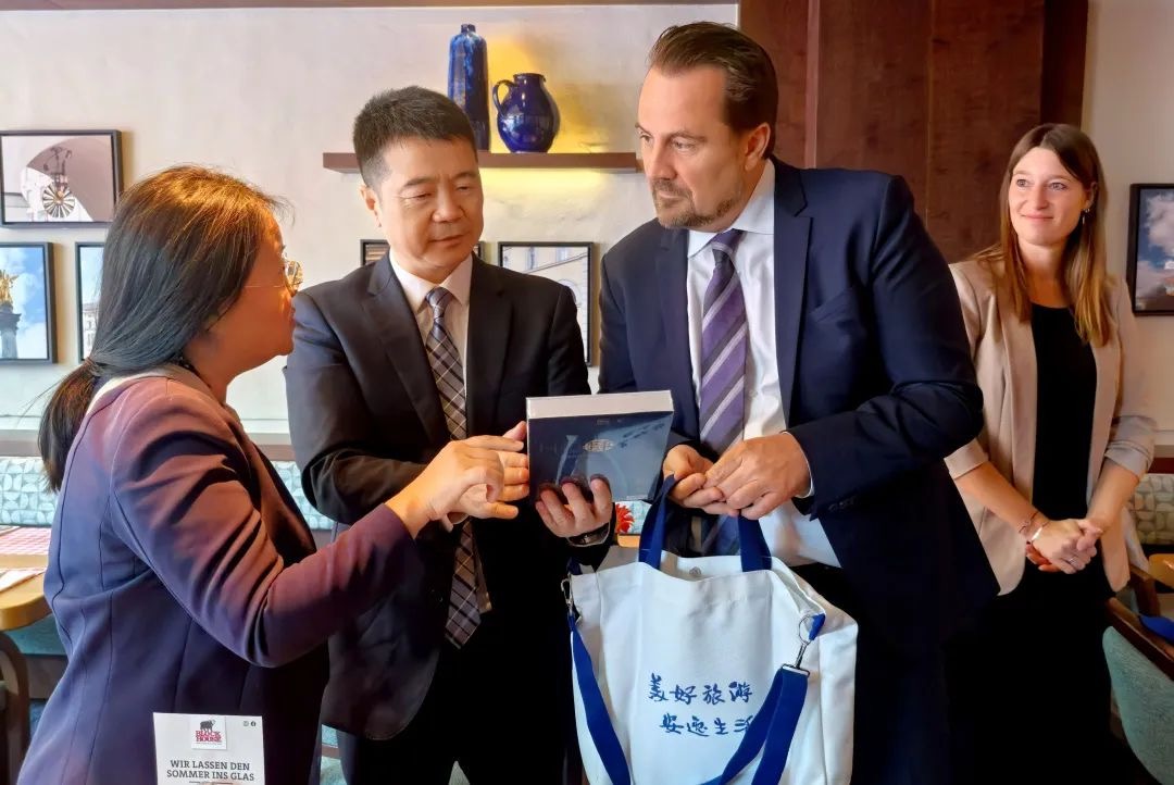 在巴伐利亚州,,,,,,游勇与巴伐利亚州食品、农业、林业和旅游部旅游营销部旅游产业部门负责人Eva G?tz博士、慕尼黑国际展览中心 (Freizeitmesse free) 展览总监Katrin Leideritz 女士、巴伐利亚州投资促进局投资者服务高级经理Fang Wang 女士、慕尼黑州首府、劳动和经济事务部地区营销主管Rita Roider女士等机构负责人座谈,,,,,,详细介绍了省5001拉斯维加斯集团旗下景区、酒店、康养及旅行社资源等情况,,,,,,双方聚焦文旅资源开发、市场联动、文旅展会市场拓展等进行深入交流,,,,,,推动项目合作精准对接。。。。。。